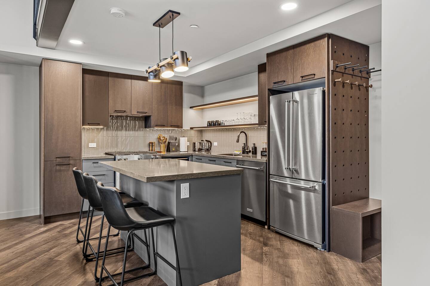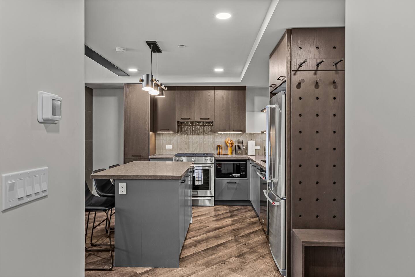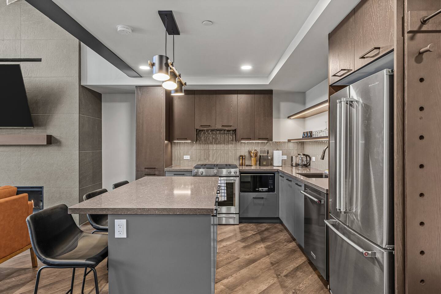 The space is thoughtfully designed to offer luxurious comfort, privacy, and incredible views of the rocky mountains. ✦ Living Area ✦ ✧ Large gas Fireplace ✧ 75 inch smart TV with cable / live TV ✧ Pull out couch that converts into to a comfortable bed (sheets & linens provided) ✧ Mountain Views ✦ Kitchen/Dining ✦ ✧ Fully equipped kitchen with modern high-end appliances ✧ Stainless Steel Oven & Natural Gas Stove Top with 4 burners ✧ Granite Countertops ✧ Full size Fridge w/ built in Water Filter and Ice-maker ✧ Includes all Cookware, Dishes, Utensils, & Glasses ✧ Dishwasher (w/pods), kettle, toaster, & coffee maker ✧ Coffee & Tea Bar includes coffee grinds, a selection of teas, sugar, & coffee mate ✧ Mountain Views ✦ Bedroom Main Floor ✦ ✧ Queen Size Bed ✧ Ceiling spotlight for natural light ✧ Adjacent to the Full Bathroom ✦ Bedroom 2nd Floor (stairs required) ✦ ✧ King Size Bed ✧ Private Full Bathroom ✧ Open-Layout Concept ✧ Mountain Views ✦ Bathrooms ✦ ✧ Include Bath towels, Face towels, Hand towels, & Pool towels for each guest ✧ Showers & Tubs come standard with body-wash, shampoo, & conditioner ✧ Hair Dryer ✧ Cleansing Wipes ✦ Laundry ✦ ✧ Ensuite Washer & Dryer with detergent and dryer sheets provided ✦ Balcony / Patio ✦ ✧ BBQ w/ natural gas hookup and BBQ utensils ✦ Parking ✦ ✧ 1 Underground Heated Assigned spot is included ✧ Visitor parking available surface level